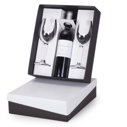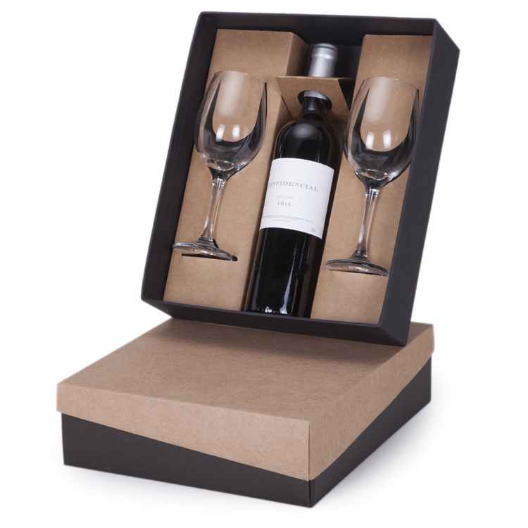 1 Vinho Português Confidencial tinto 750 ml 2 Taças de vidro Barone 385ml 7156 1 Caixa e berço corte e vinco em papel cartão preto 400gr e kraft ou branco 300gr 34x28x9cm / Peso 1.990g F48.9 / T283 / b263