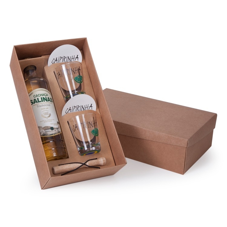 1 Cachaça Mineira Salinas Tradicional 700ml Armazenada 3 anos em toneis de bálsamo. Graduação Alcoolica 42% 2 Copos de vidro para caipirinha 216ml 2 Porta copos de PVC 1 Socador de madeira 1 Caixa e berço em corte e vinco em papel cartão FSC certificado 400gr 34x19x10cm / Peso 1.960g B64