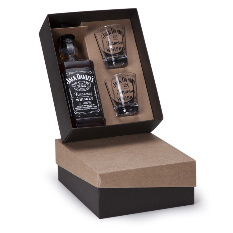 1 Whiskey Jack Daniel´s Litro 2 Copos de vidro 216ml 1 Caixa corte e vinco em papel cartão preto e kraft ou preto e branco 400gr Peso 2.170g / 28x22x10cm
