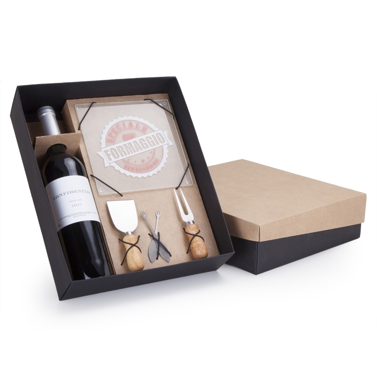 1 Vinho Português Confidencial tinto 750 ml 1 Tábua de vidro para queijo 18x18cm 2 Facas para queijo 2 Garfinhos 1 Caixa e berço corte e vinco em papel cartão 34x28x9cm / Peso 2.210g B82/T283/F48-9
