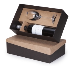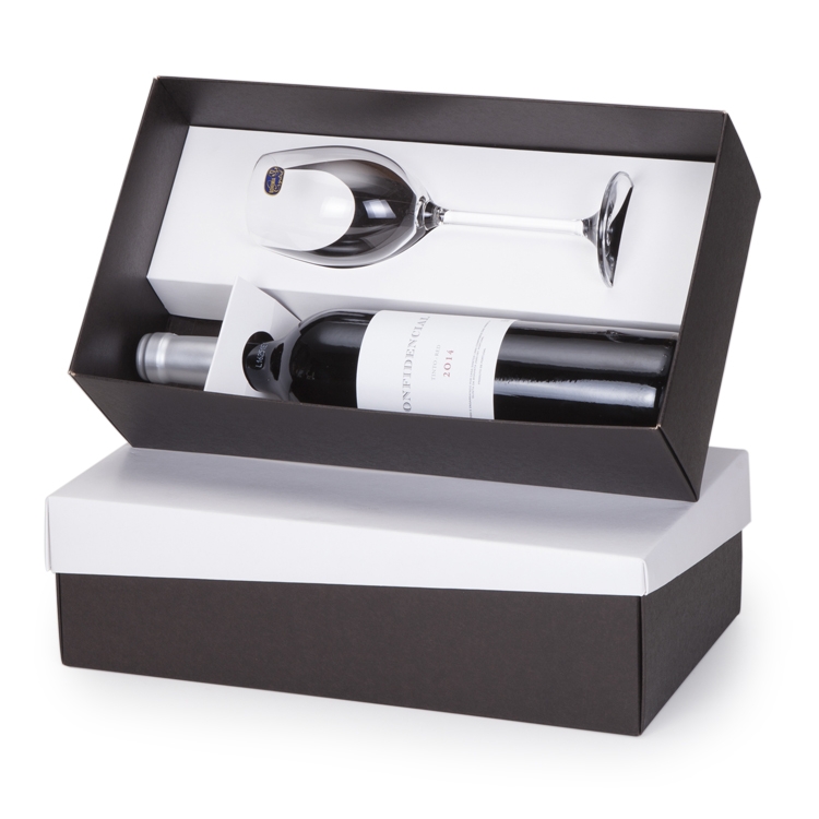 1 Vinho Português Confidencial tinto 750ml 1 Taça para vinho de cristal Bohemia Roberta 450ml 1 Caixa e berço corte e vinco em papel cartão 34x19x10cm / Peso 1.690g B265 ou 220 /FCP50/ T285