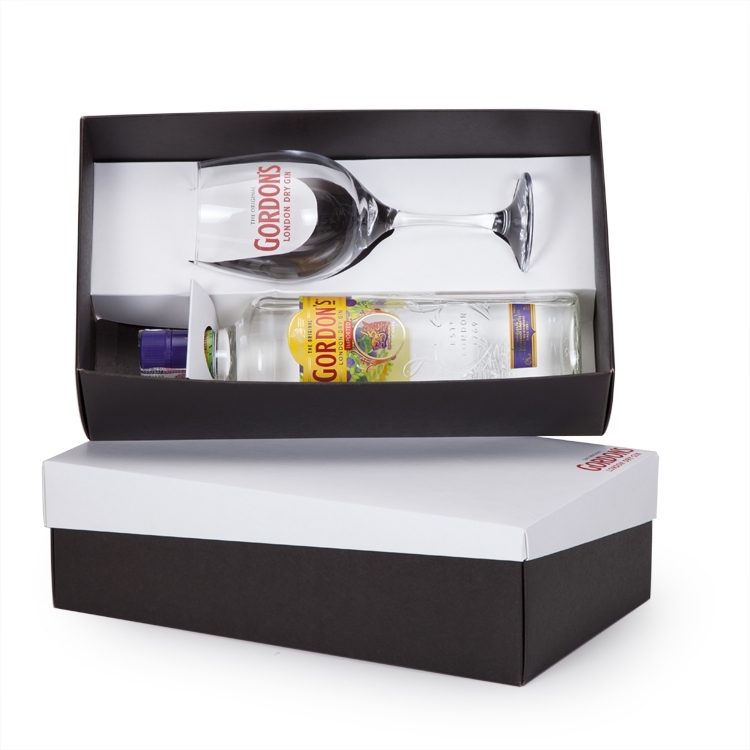 1 Gin Gordon´s London Dry 750ml 1 Taça de vidro 490ml (7056) 1 Caixa e berço corte e vinco em papel cartão 34x19x10cm / Peso 1.700g B265 ou 220 /FCP50/ T285
