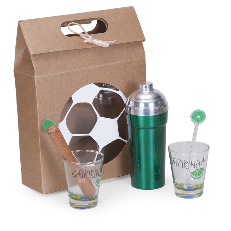 1 Coqueteleira de aluminio 1 Socador de limão 2 Mexedores de drink 2 Copos para caipirinha 216ml 1 Maleta corte e vinco em papel cartão FSC certificado 400gr Peso 0.660g / 24x8x32.5cm F123