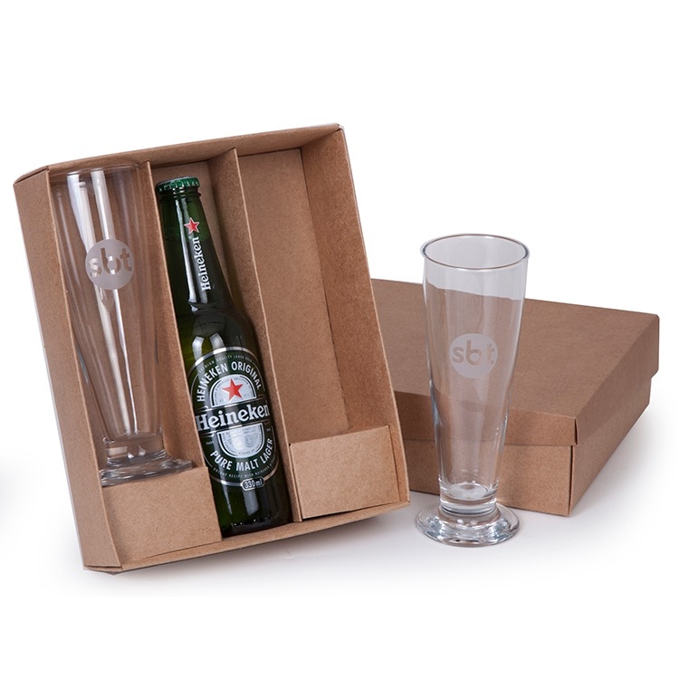1 Gfa de cerveja Heineken 250ml 2 Tulipas de vidro 300ml 1 Caixa e divisória corte e vinco em papel cartão kraft FSC certificado 400gr 24x19.5x7cm / Peso 1.190g Personalizamos com sua logomarca, consulte !