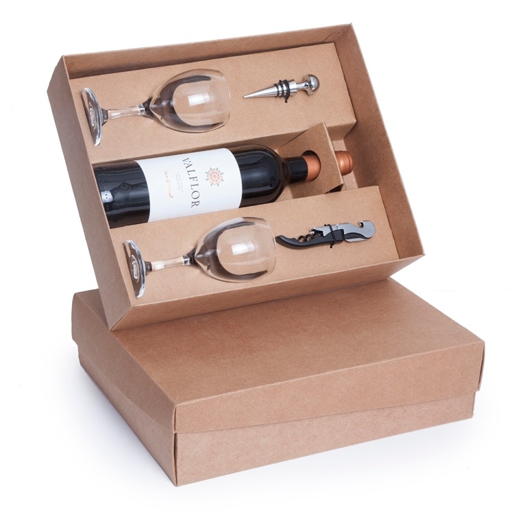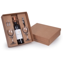 1 Vinho Português VALFLOR tinto 750ml 2 Taças de vidro 190ml (7128) 1 Tampa para vinho ou cortador de lacre 1 Saca rolhas dois estágios 1 Caixa corte e vinco em papel cartão kraft 400gr 34x28x9cm / Peso 2.100g
