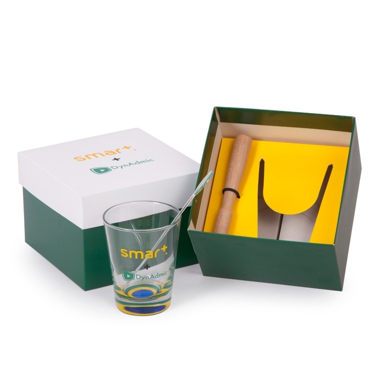 Kit caipirinha personalizado em 3 cores na caixa e no copo.