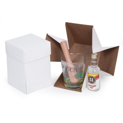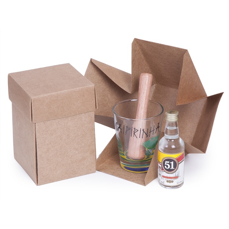 1 Cachaça 51 Pirassununga 50ml 1 Socador de madeira 1 Copo personalizado caipirinha 216ml 1 Caixa corte e vinco em papel cartão kraft ou branco 300gr Peso 0,152g / 9,3x9,3x14cm.