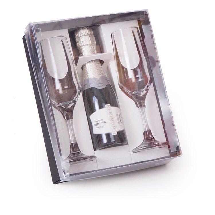 1 Caixa corte e vinco em papel cartão preto 1 Berço corte e vinco em papel cartão branco 1 Tampa transparente em PVC Cristal 24x19.5x7cm Berço desenvolvido para espumante de 187ml e taça 186ml SM Buffet Nadir (foto ilustrativa) não acompanha bebidas e taças cp22se baby02SE