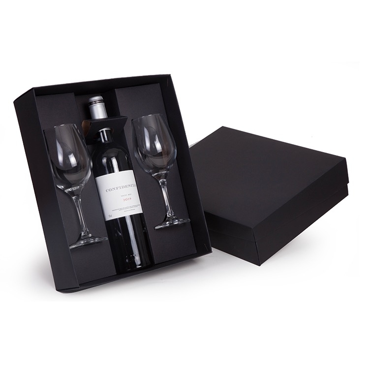 1 Vinho Português Confidencial tinto 750 ml 2 Taças de vidro Barone 385ml 7156 1 Caixa e berço corte e vinco em papel cartão preto 400gr 34x28x9cm / Peso 1.990g F48.9 / T283 / b263