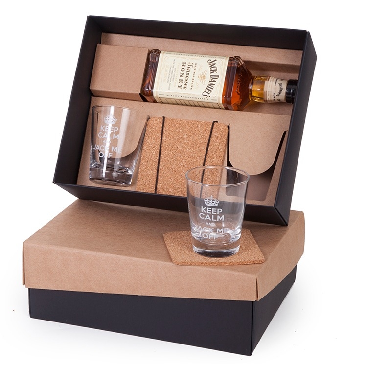 1 Whiskey Jack Daniel´s Honey 375ml 2 Copos de vidro 216ml 2 Porta copos de cortiça 1 Caixa e berço corte e vinco em papel cartão 28x22x10cm/peso 1.490g