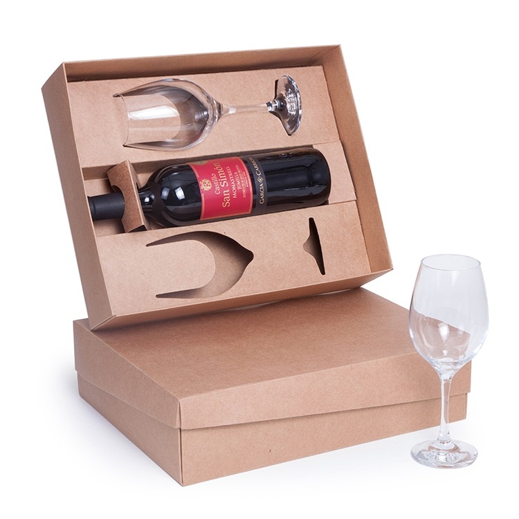 1 Vinho Espanhol Castillo San Simon D.O.P Monastrell Jumilla tinto 750ml 2 Taças de vidro Barone 385ml 7156 1 Caixa e berço corte e vinco em papel cartão kraft 400gr 34x28x9cm / Peso 1.990g