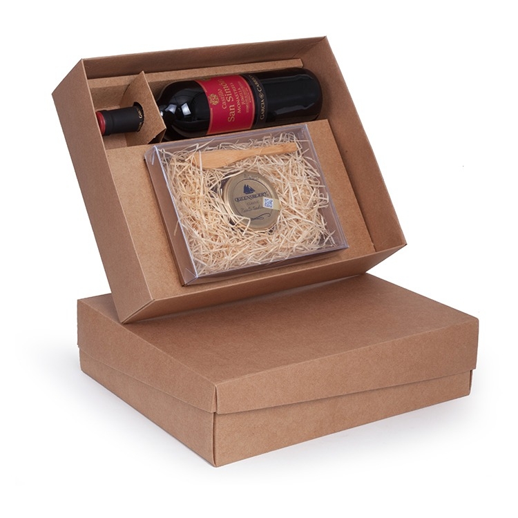 1 Vinho Espanhol Castillo San Simon D.O.P Monastrell Jumilla tinto 750ml 1 Geleia Agridoce de Pimenta Vermelha Gourmet 320g 1 Espatula de bambu 1 Caixa e berço corte e vinco em papel cartão kraft 34x28x9cm / Peso 2.100g