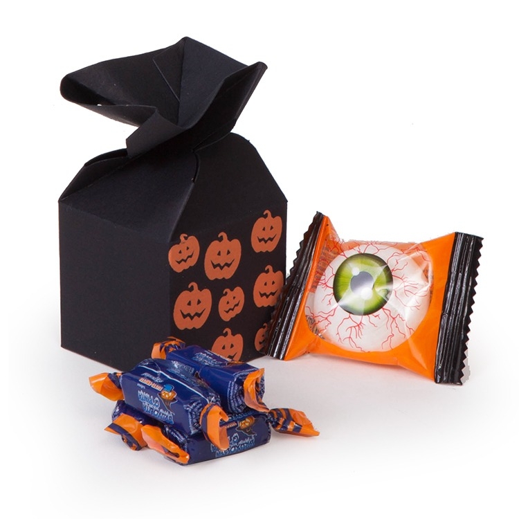 Personalizamos com sua logomarca! 1 Olho de Marshmallows Malloween sabor baunilha com recheio de morango 4 Balas BRUXOLITA Q PINTA sabor tutti frutti Caixa corte e vinco em papel cartão preto decorado 5x5x9cm / Peso 0,055g