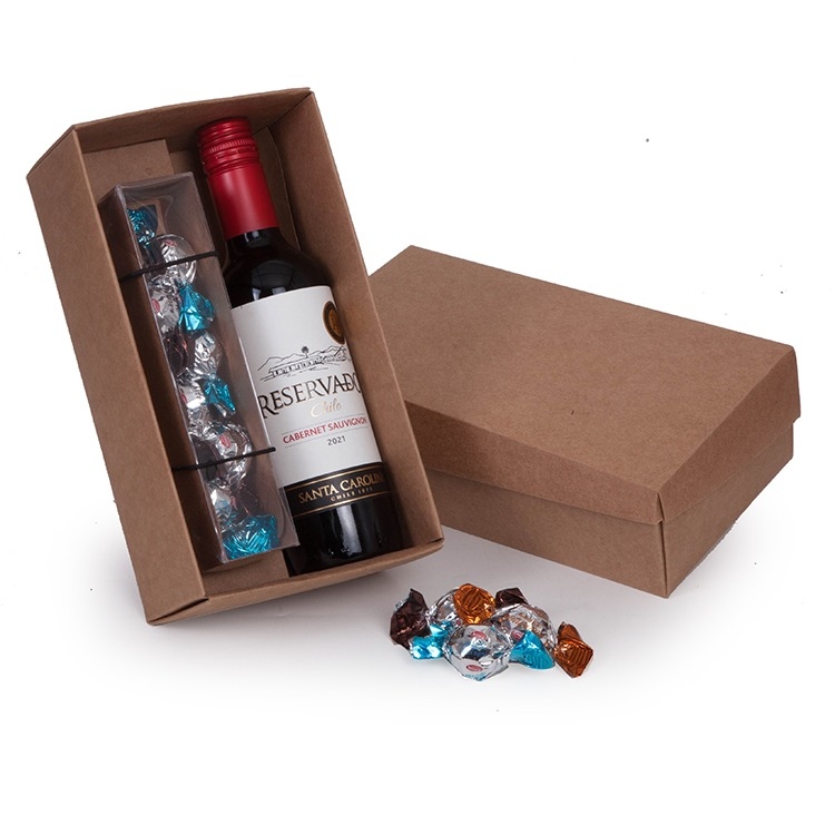 1 Vinho Chileno Santa Carolina Reservado Cabernet Sauvignon tinto 375ml 5 Unid Bombons Witor´s Selection Crispy 1 Caixa e berço corte e vinco 300/200gr 23.5x13x7cm / peso 0,890gr vinhobombom