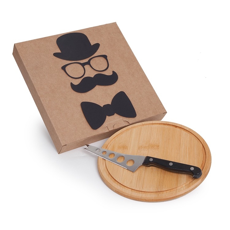 1 TABUA REDONDA EM BAMBU COM SULCO 21 X 21 X 1.2 CM 1 Faca de inox para queijo 1 Caixa corte e vinco em papel cartão preta ou kraft com apliques 400gr 24.5x24.5x3.5cm / Peso 0.400g F275