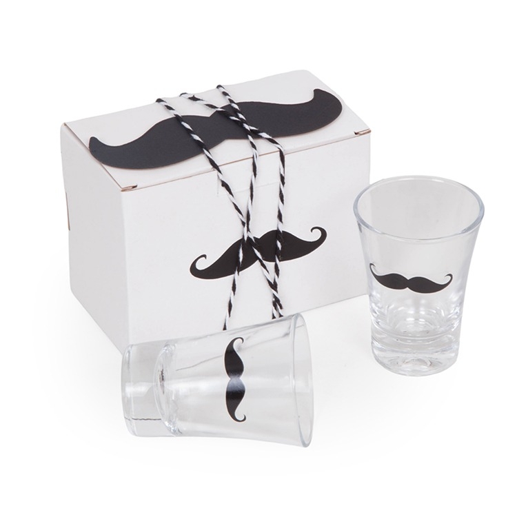 2 Copos de dose 60ml 1 Caixa corte e vinco em papel cartão com aplique e silk 300gr Peso 185g / 11x5.7x8cm
