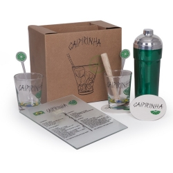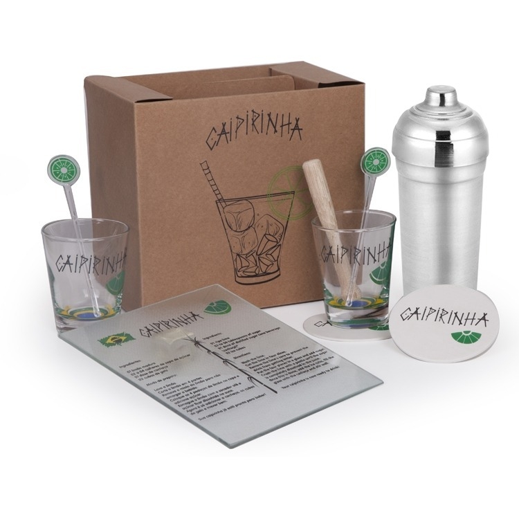 1 Coqueteleira de aluminio 600ml 1 Socador de limão 2 Mexedores de drink 2 Copos de vidro para caipirinha 2 Porta copos de E.V.A 1 Tábua de vidro com receita caipirinha ingles/português 1 Caixa e berço em corte e vinco em papel cartão FSC certificado 400gr Peso 1.050g / 21x14x20cm F250