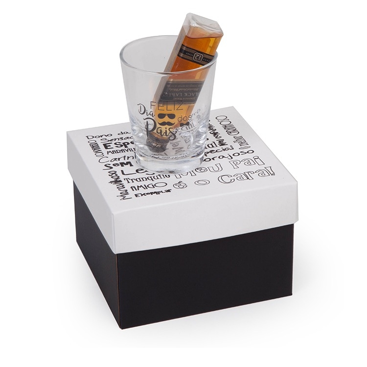 1 Whisky Johnnie Walker Black label 50ml 1 Copo de vidro cônica old fashioned 216ml 7101 1 Caixa e berço corte e vinco em papel cartão 14x14x10cm / Peso 0.330g F259/259B/02B