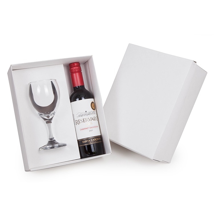Caixa e berço corte e vinco em papel cartão branco 360g 24x19.5x8.5cm Berço desenvolvido para garrafa de vinho 375ml altura máxima 24cm e taça de vidro Windsor 250ml - Nadir - ref 7128 (foto ilustrativa) não acompanha bebida e taça B513