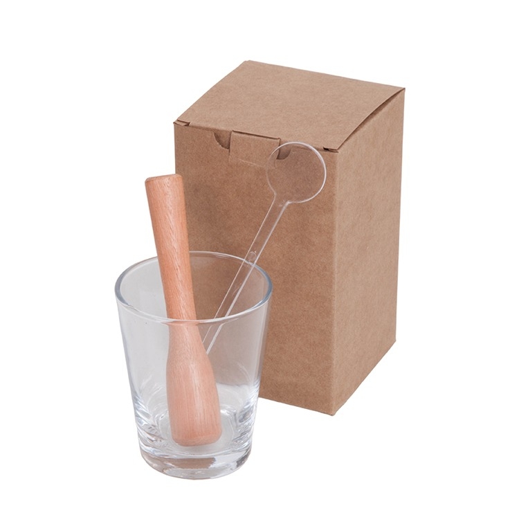 1 Socador de limão 1 Mexedor de acrílico 1 Copo de vidro para caipirinha limão 216ml 1 Caixa corte e vinco em papel cartão branco ou kraft 8.5x8.5x14.3cm/Peso 360g F95