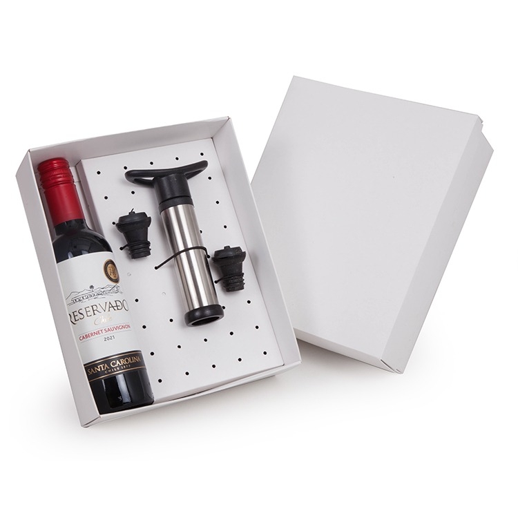 1 Vinho Chileno Santa Carolina Cabernet Sauvignon 375ml 1 Kit Bomba Vácuo Vinho 15,5cm com 2 tampas 1 Caixa e berço corte e vinco em papel cartão kraft ou branco 360gr 24x19.5x7cm / Peso 0.960gr Conserve seu vinho por mais tempo! Abriu uma garrafa de vinho mas não conseguir beber toda? Não se preocupe, com a bomba a vácuo você pode guardar seu vinho por mais tempo e preservar as características originais do vinho! Também é uma ótima opção de presente para aquele seu amigo enófilo
