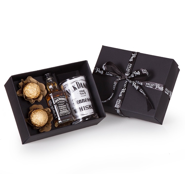 1 Whiskey Jack Daniel´s 50 ml 1 Copo de vidro personalizados 216ml 2 unid Bombom Ferrero Rocher 1 Caixa e berço corte e vinco em papel cartão 17x13x6cm / Peso 0,400gr whiskyminiatura