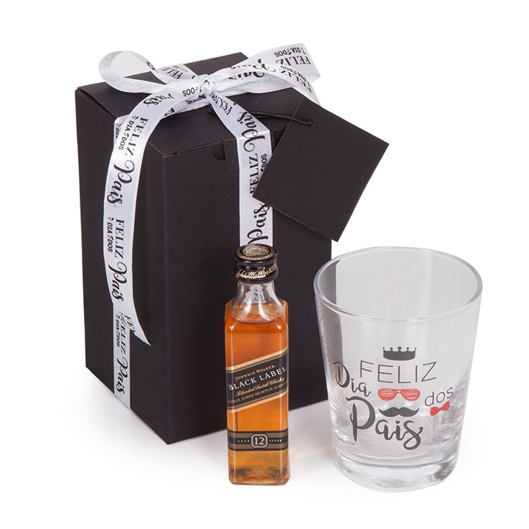1 Whisky Johnnie Walker Black label 50ml 1 Copo de vidro 216ml 1 Caixa corte e vinco em papel cartão preto 8.5x8.5x14.3cm/Peso 250g F95