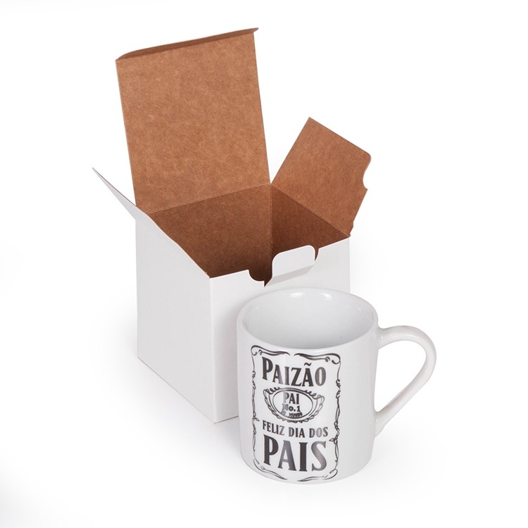 1 Caneca reta de porcelana 280ml 9x8cm 1 Caixa corte e vinco em papel cartão branco 360gr 10x10x10cm /peso 0,430gr F526