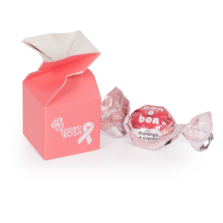 1 Bombom Arcor morango e creme 1 Caixa corte e vinco em papel cartão rosa 225gr medidas 6.5x6.5x11.5cm / Peso 0.0022gr Personalizamos com sua logomarca, consulte!
