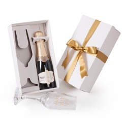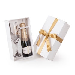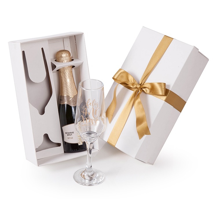1 Espumante Chandon Reserve 187ml 1 Taça Buffet de vidro para Champagne 186ml 1 Caixa e berço corte e vinco em papel cartão branco 360gr com laço de cetim dourado 23.5x13x7cm / peso 0.730g F168/168B/50/246 BABY1