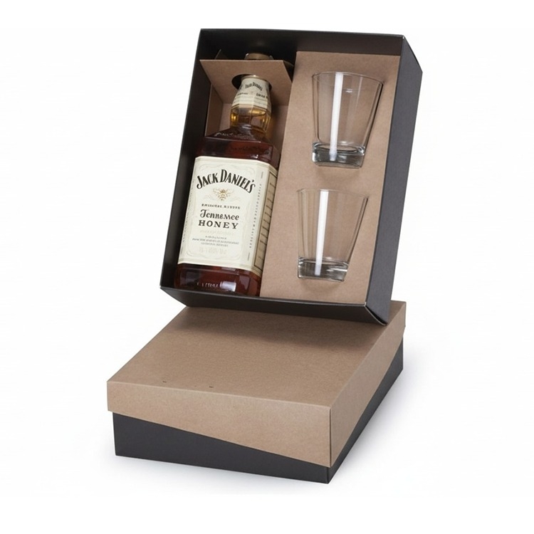 Caixa e berço corte e vinco em papel cartão Preto e kraft 28x22x10cm fundo preto 400gr tampa e berço kraft 400gr Berço desenvolvido para ; 1 Whiskey Jack Daniel´s 750ml 2 Copos Caldereta Old Fashion 220ml 7101 (foto ilustrativa) não acompanha bebida e copos