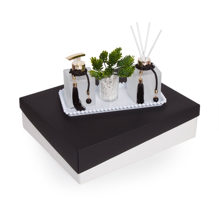2 Frascos de vidro 250ml 1 Válvula dourada para saboneteira 1 Tampa dourada para difusor 4 Varetas de fibra de algodão 2 Pingentes decorativos 1 Vasinho de vidro 6x4.5cm + ramo de folhagem artificial 1 Bandeja plástica branca 12.5cm X 25cm 1 Caixa e berço corte e vinco em papel cartão preto e branco 400gr 34x28x9cm / Peso 1.300kg Personalizamos com sua logomarca, consulte! Obs; não acompanha sabonete e aroma.