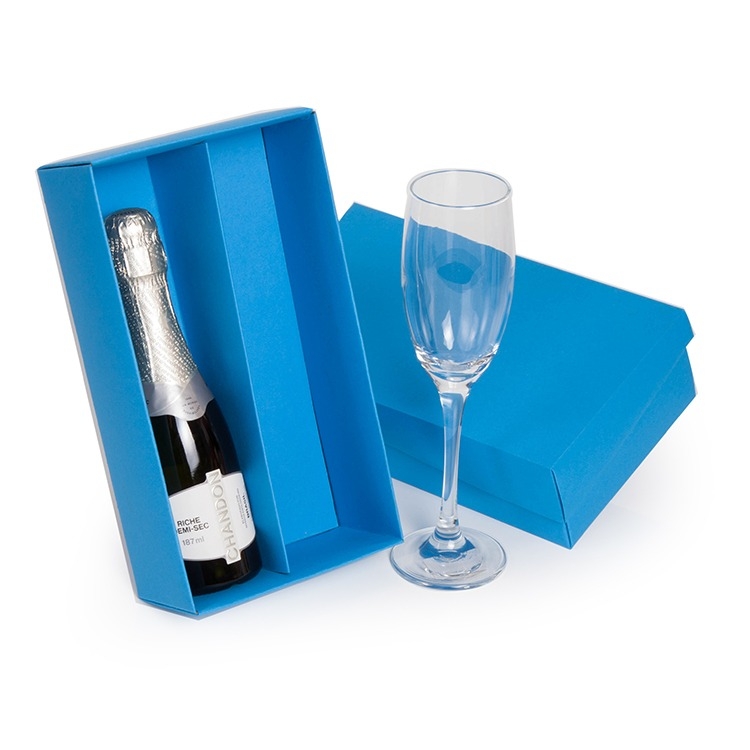 1 Caixa e divisória corte e vinco em papel cartão azul Grécia 400gr e tampa 200gr 23.5x13x7cm caixa desenvolvida para espumante de 187ml (foto ilustrativa) não acompanha bebida e taça F168/168B/50/246 baby01SE
