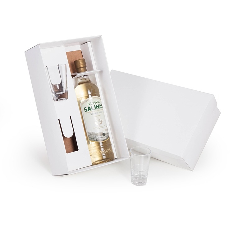 1 Cachaça Mineira Salinas Tradicional 700ml Armazenada 3 anos em toneis de balsamo. Graduação Alcoolica 42% Vol. 2 Copos de vidro caninha dose 100ml (3033) 1 Caixa e berço corte e vinco em papel cartão branco 360gr Personalizamos com sua logomarca, consulte! 34x19x10cm / Peso 1.710g