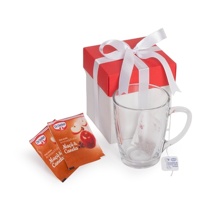 1 Caneca Tarsila de vidro 300ml (5921) 11 x 7,8 x 10,5 cm 2 Saches de Chá Dr.Oetker 1 Caixa corte e vinco em papel cartão com laço de cetim Personalizamos com sua logomarca, consulte! 9.5x10x11.5cm / peso 0.300g
