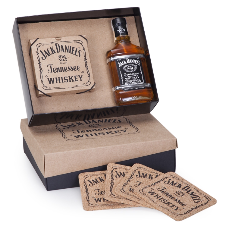 1 Whiskey Jack Daniel´s 200ml 1 Cj com 4 porta copos em cortiça 10.7x10.7cm 1 Caixa e berço corte e vinco em papel cartão Peso 0.604g / 28x22x10cm
