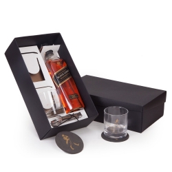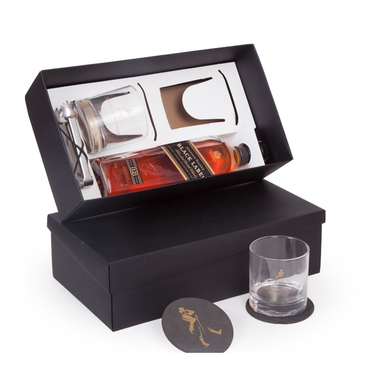 1 Whisky Johnnie Walker Black Label 750ml 2 Copos rocks de vidro 310ml (J255) 2 Porta copos em E.V.A 1 Pinça em aço inox para gelo 1 Caixa e berço corte e vinco em papel cartão preto 400gr e branco 300gr Peso 1.950g / 34x19x10cm