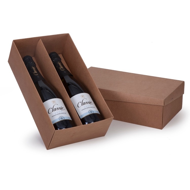 1 Caixa e divisória corte e vinco em papel cartão kraft 34x19x10cm Ideal para duas garrafas de e 750ml (foto ilustrativa) não acompanha bebida