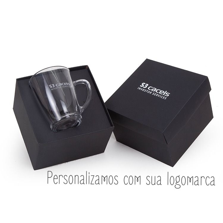 1 Caneca Tarsila de vidro 300ml (5921) 11 x 7,8 x 10,5 cm 1 Caixa e berço corte e vinco em papel cartão preto fundo e berço 400g tampa 200gr com laço de cetim Personalizamos com sua logomarca, consulte! 14x14x10cm Peso 450g F539