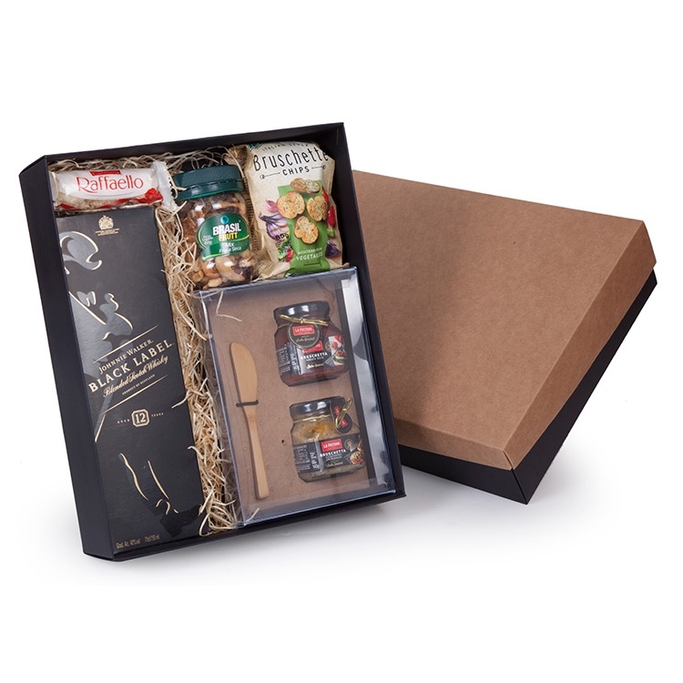 1 Whisky Escocês Johnnie Walker Black Label 750ml 1 Bruschetta Italiana de tomate seco La Pastina 140g 1 Bruschetta Italiana de Alcachofra La Pastina 140g 1 Espatula de bambu 1 Mix de frutas secas Brasil Frutt 150g 1 Bruschette Chips 85g 1 Raffaello com 3 Unidades 30g 1 Caixa e berço corte e vinco em papel cartão 400gr Peso 2.500g / 34x28x9cm