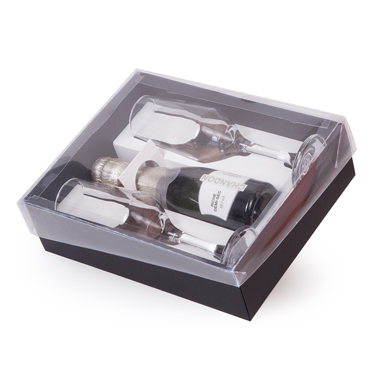 1 Caixa corte e vinco em papel cartão preto 1 Berço corte e vinco em papel cartão branco 1 Tampa transparente em PVC Cristal 24x19.5x7cm Berço desenvolvido para espumante de 187ml e taça 186ml SM Buffet Nadir (foto ilustrativa) não acompanha bebidas e taças cp22se baby02SE