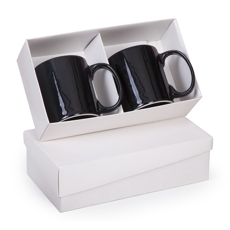 2 Canecas reta de porcelana 300ml 9x8cm 1 Caixa e divisoria corte e vinco em papel cartão branco ou kraft 300gr 23.5x13x8cm