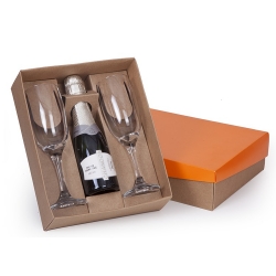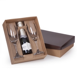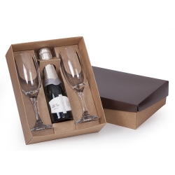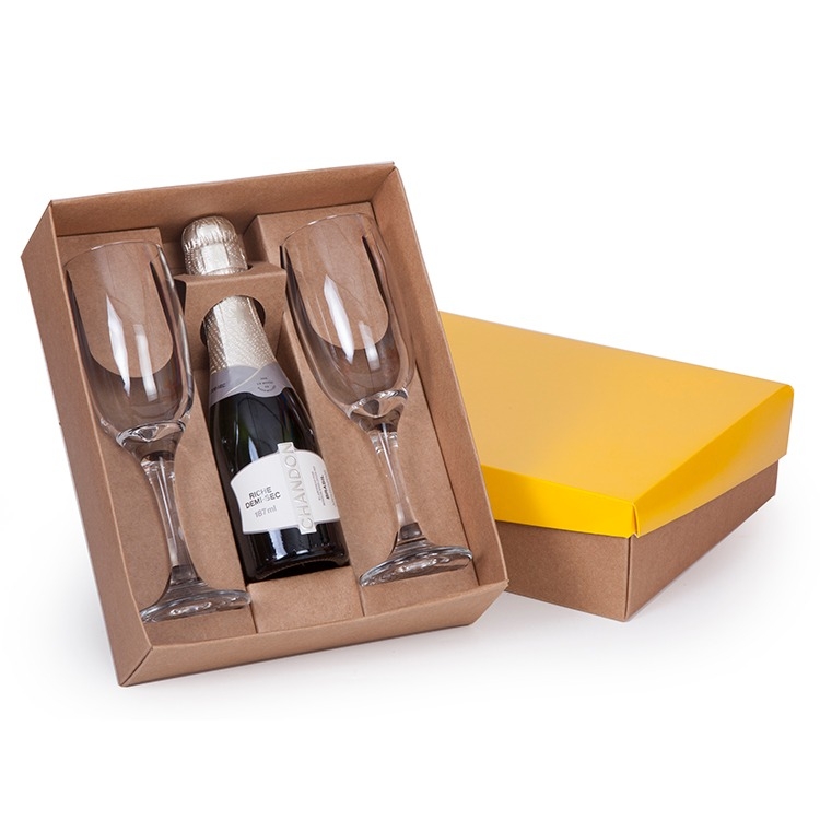 1 Caixa e berço corte e vinco em papel cartão kraft 400g / tampa 225gr 24x19.5x7cm Berço desenvolvido para espumante 187ml e Taça Windsor de vidro 210ml (7828) (foto ilustrativa) não acompanha bebidas e taças cp22se baby02SE