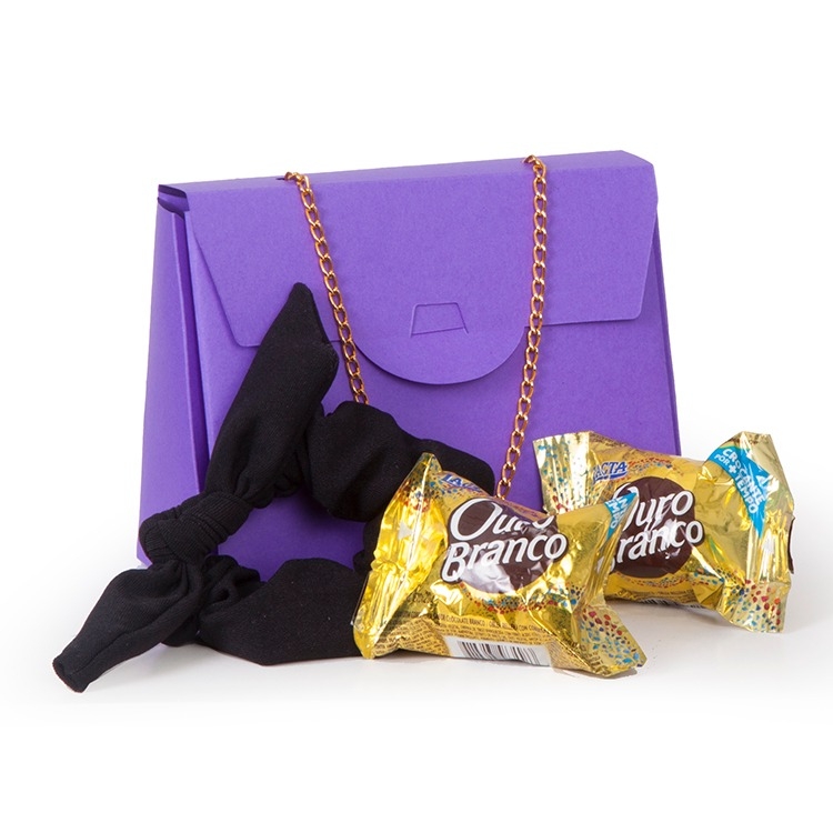 1 Bolsa corte e vinco em papel cartão lilas 225g 2 Bombons Ouro Branco 1 Frufru em tecido preto Peso 0,100g dimensões 13.5 largura x 11cm altura F134