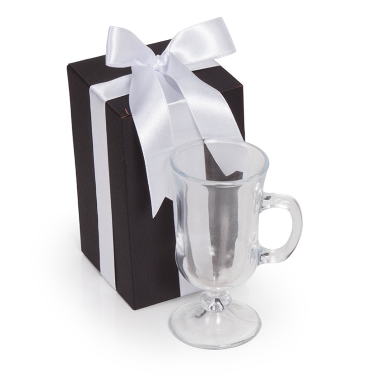 Caneca de vidro Irish Coffee Nevada 130ml altura 15cm largura com a alça 9cm boca 6cm 1 Caixa corte e vinco em papel cartão preto 400gr 8.5x8.5x14.3cm Peso 0,430gr Personalizamos com sua logomarca, consulte! F95