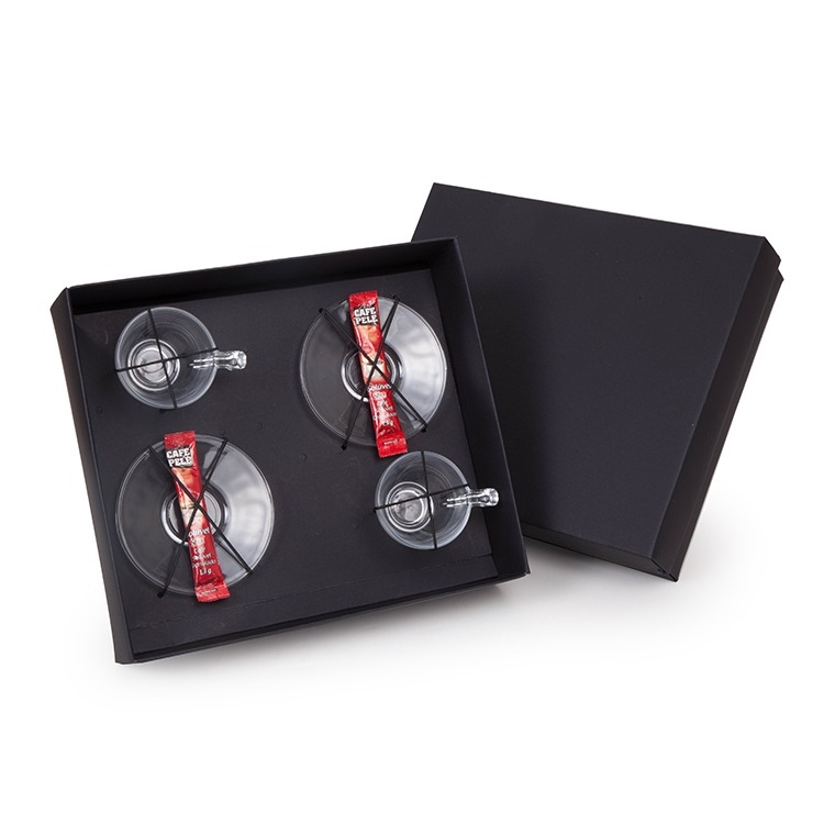 2 Xícaras astral para Café com pires 90ml 2 Stick Café Pele Solúvel 1,3g 1 Caixa corte e vinco em papel cartão preto 400gr 27X24X7CM / Peso 0.600gr Personalizamos com sua logomarca, consulte! F266b T 266 B204