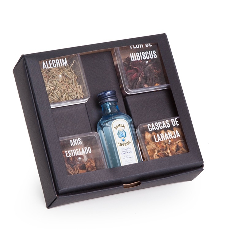 1 Gin Bombay 50ml 0,009gr de Anis Estrelado 0,015gr de Cascas de Laranja 0,011gr de Alecrim 0,014gr de Flor de Hibiscus 1 Caixa corte e vinco em papel carto preto 400gr 14.3x15x4.5cm/ Peso 0,270g F122A