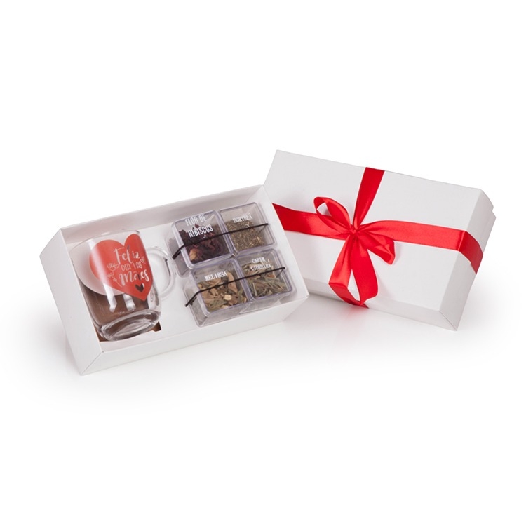 1 Caneca de vidro Aspen 300ml (5909) (5909) 11 x 8 x 8,9 cm 11gr de Hortelã 5gr de Camomila 16gr de flor de Hibiscos 8gr de Melissa 1 Caixa e berço corte e vinco em papel cartão branco 360gr 23.5x13x7cm / Peso 0390gr