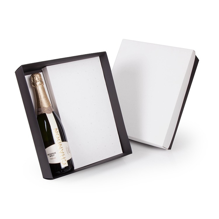 Caixa e berço multiuso corte e vinco em papel cartão preto e branco 400g 34x28x9cm Ideal para garrafa 750ml espaço 19.5x33.5cm para agenda , caneta, chaveiro (ou outros objetos) (foto ilustrativa) não acompanha bebida, agenda, caneta e chaveiro CXCHANDON750