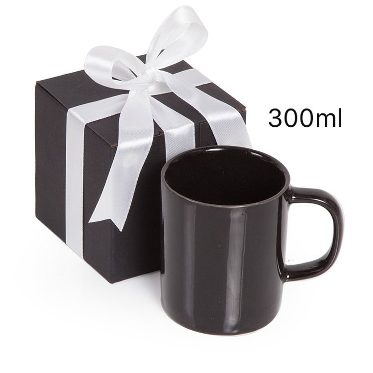 1 Caneca reta de porcelana preta 300ml 9x8cm 1 Caixa corte e vinco em papel cartão preto 400gr com laço de cetim 10x10x10cm /peso 0,430gr F526